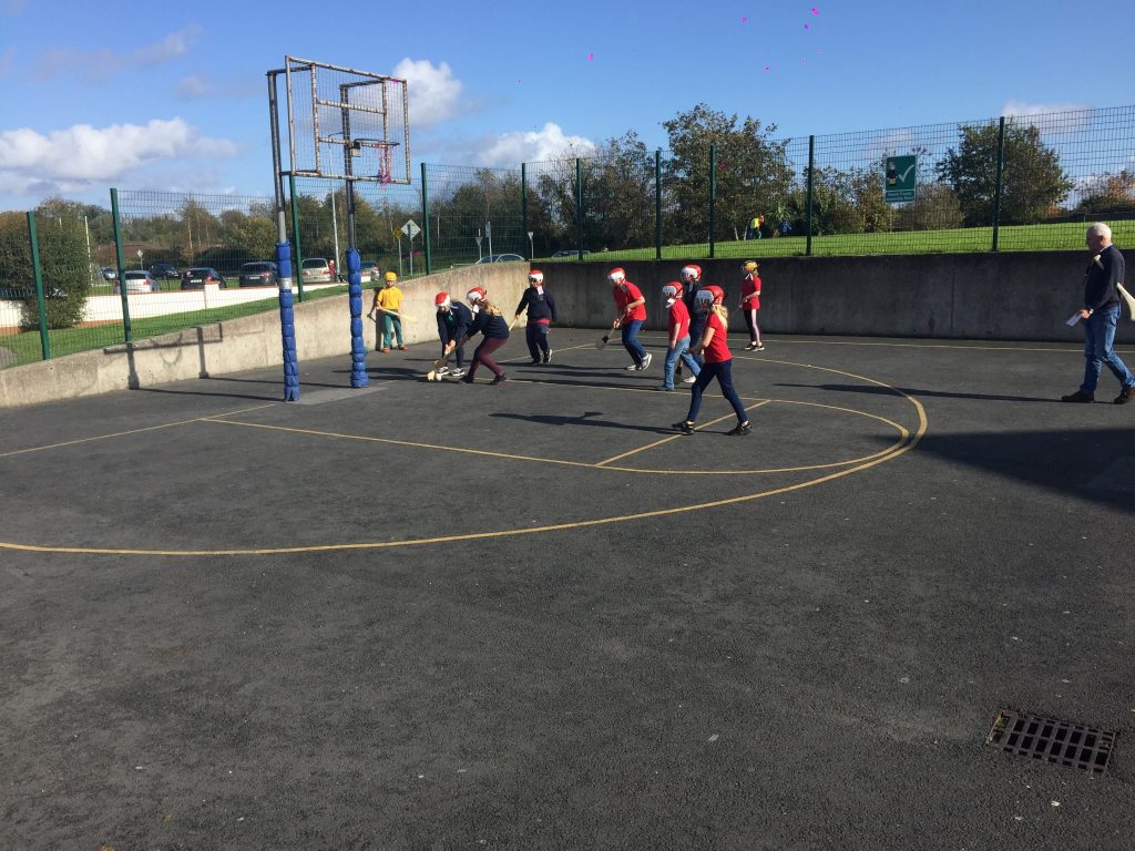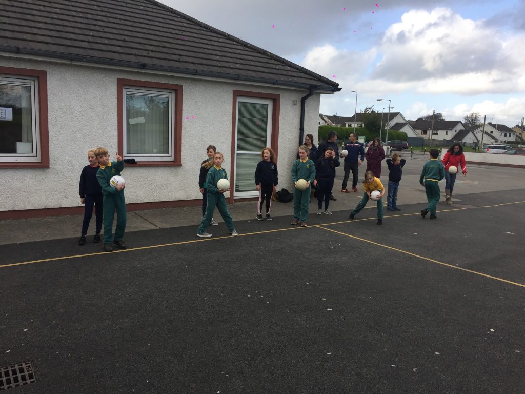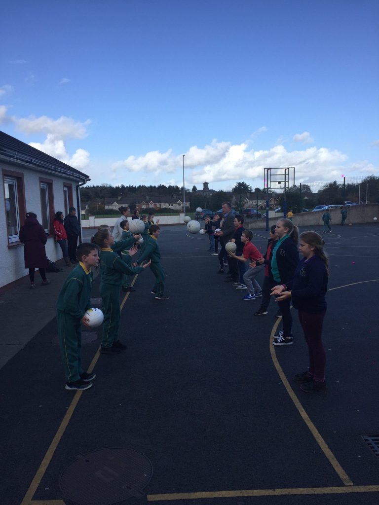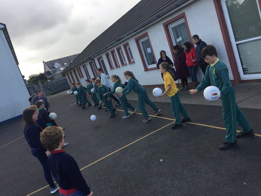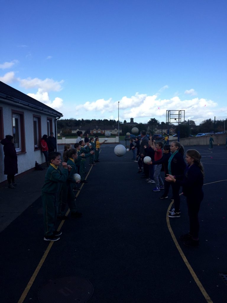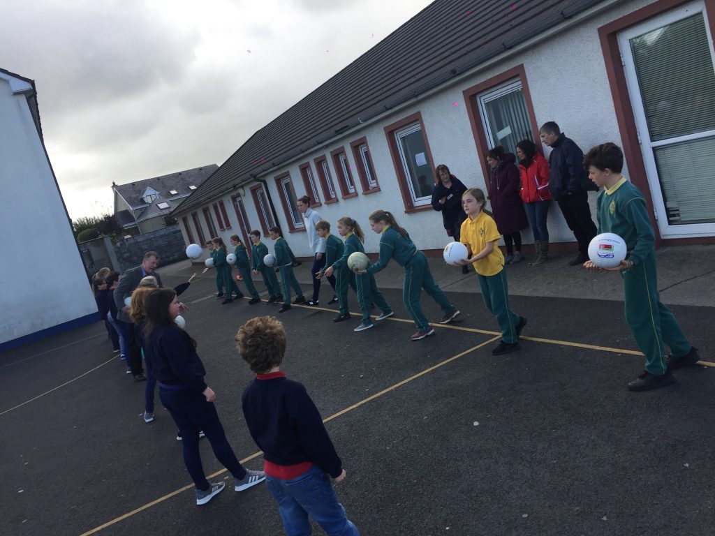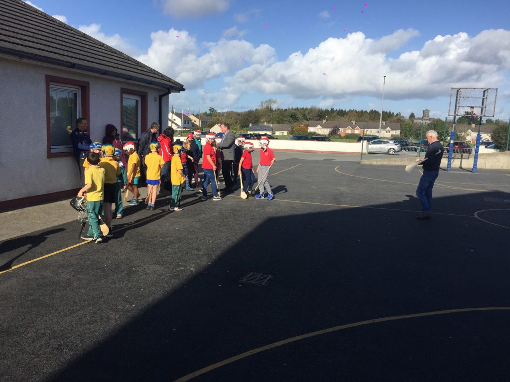 2nd and 5th class children doing hurling and football demonstrations for the people of the Isle of Man.