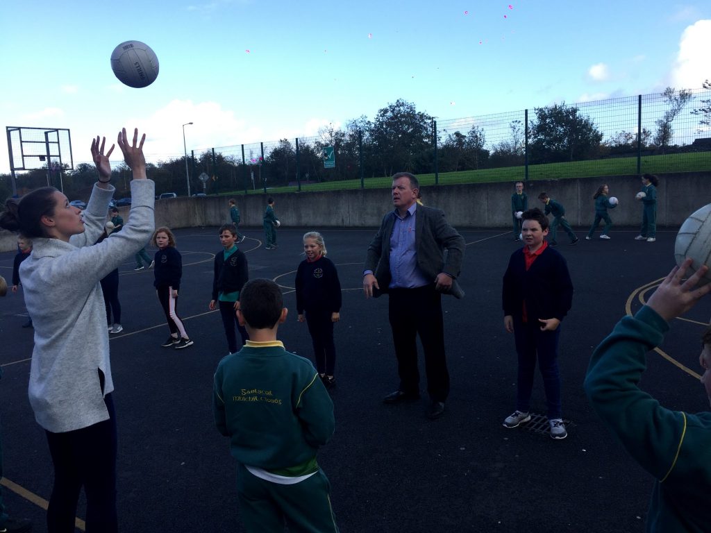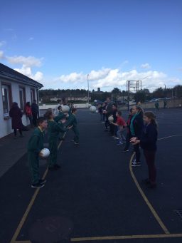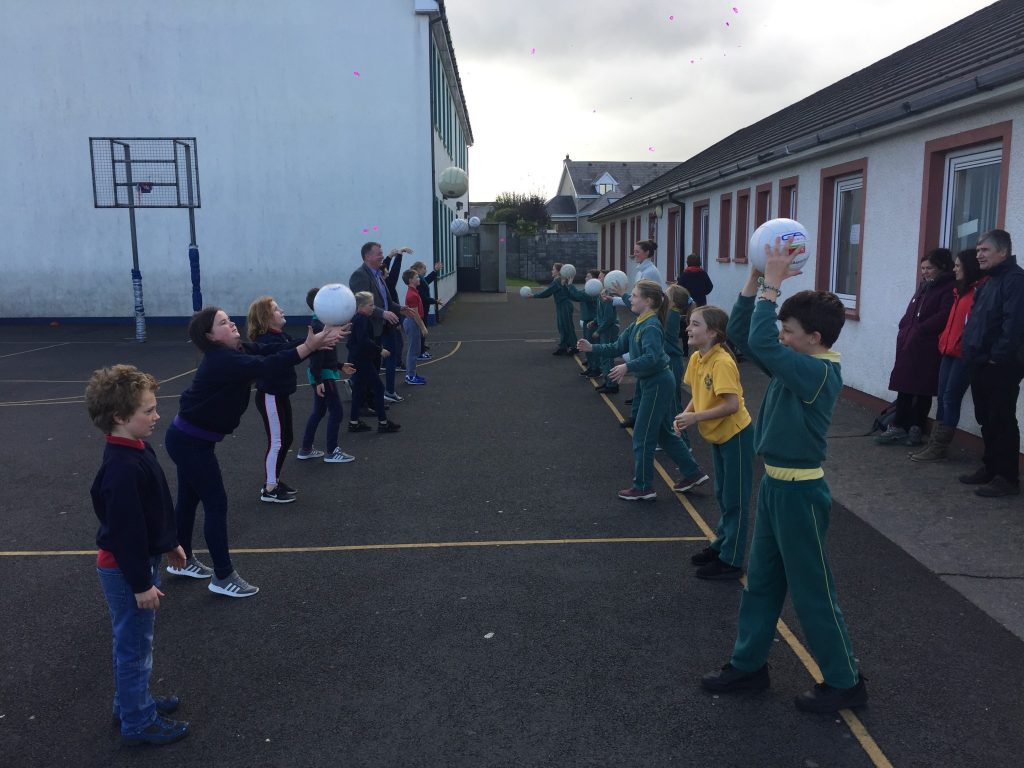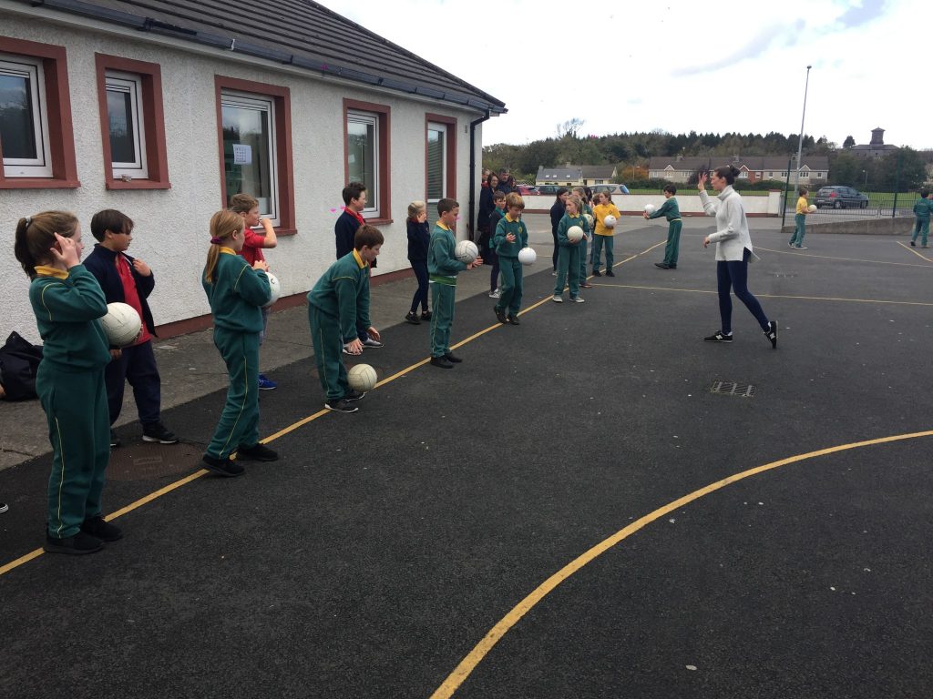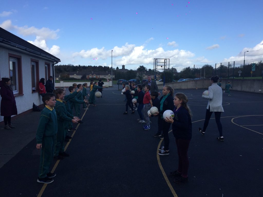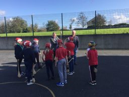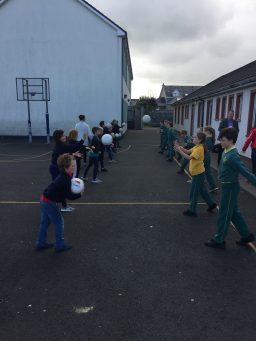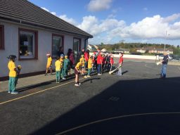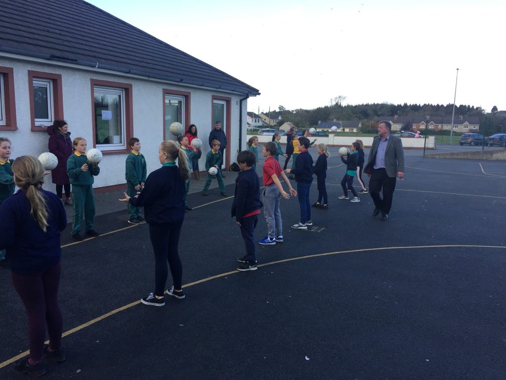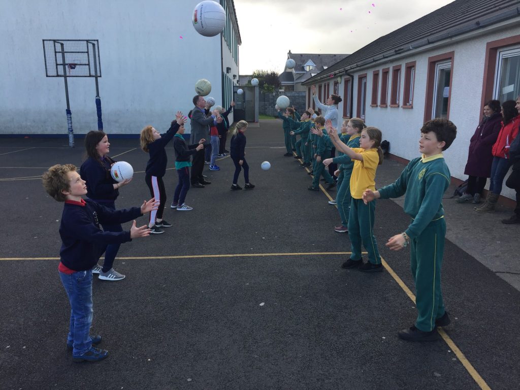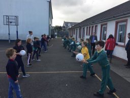 2nd and 5th class children doing hurling and football demonstrations for the people of the Isle of Man.