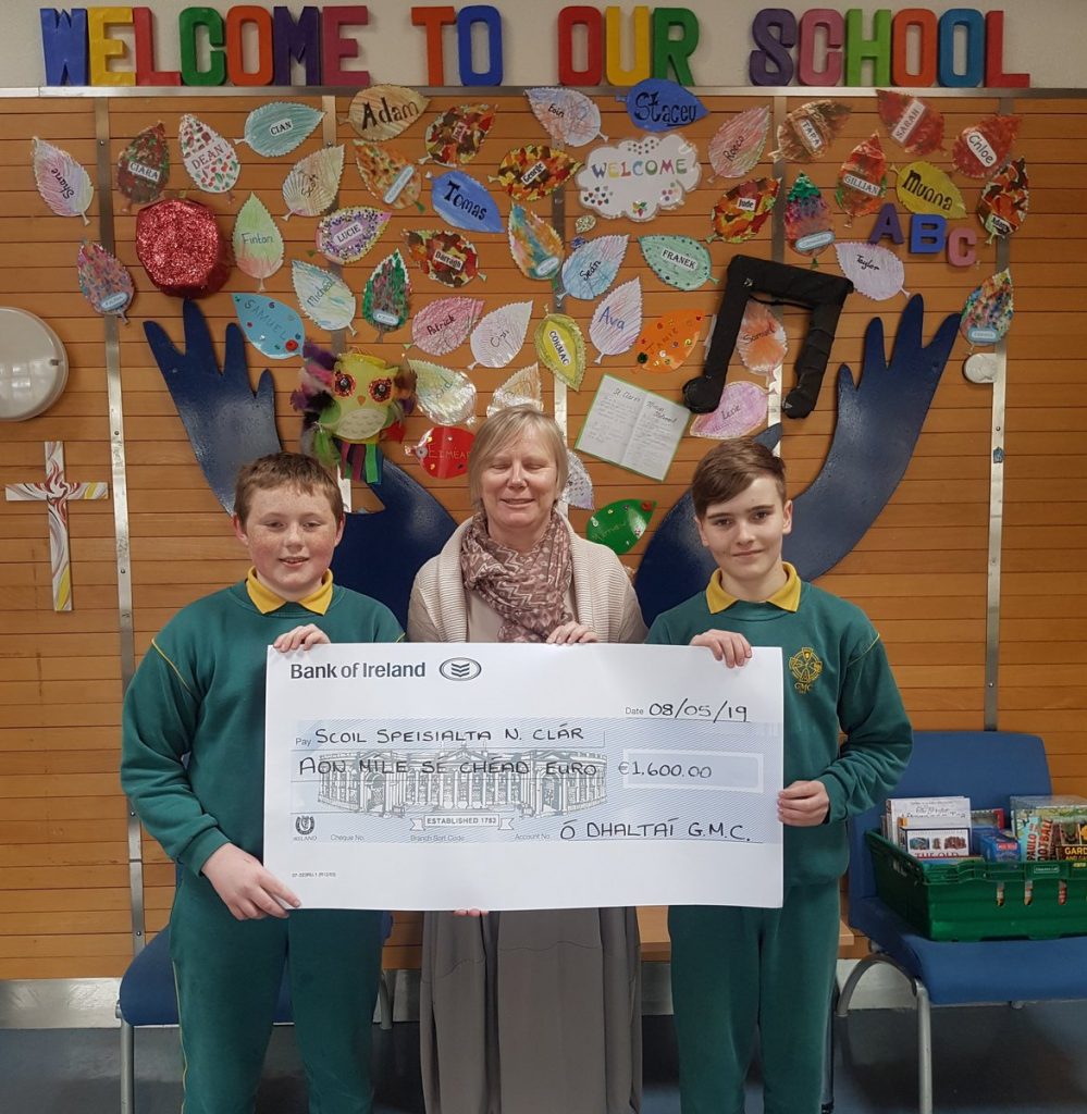 Chuaigh Mark O Rinn agus Ruairí Ó hÍomhair go St Clares le déanaí chun seic €1,600 a bhronnadh ar Moire an príomhoide. Bhí sí an-buíoch as ucht an iarracht iontach gur dhéin páístí Rang 6 agus an scoil ar an iomlán as ucht an t-airgid gur bhailíodh.. Maith sibh.