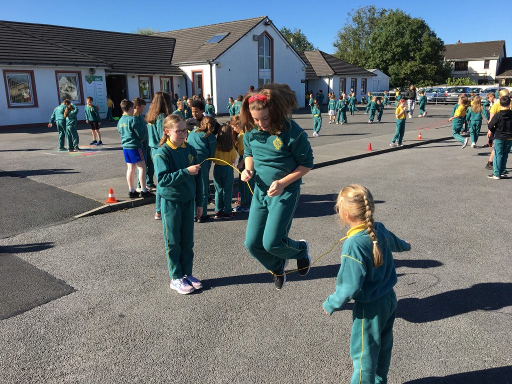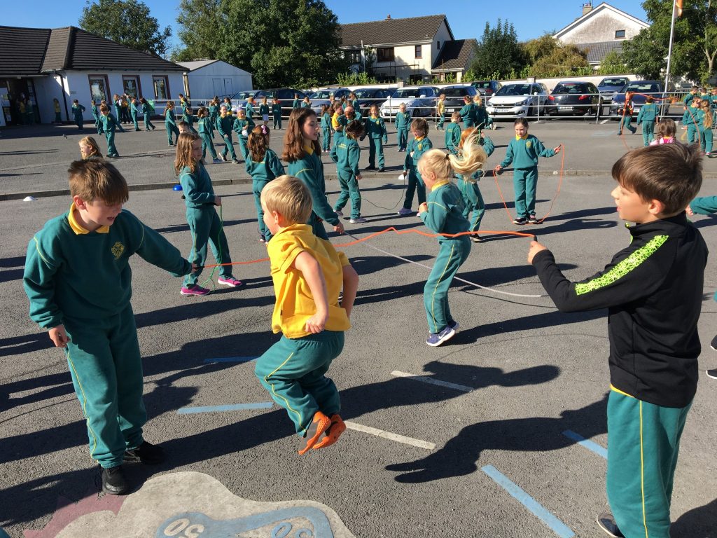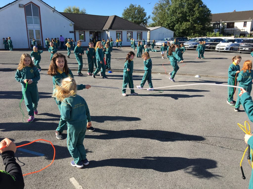 Féach ar na páistí agus iad ag scipeáil le linn am sosa, ag baint úsíád as rímeanna agus rannta gur scríobh na páistí iad féín.